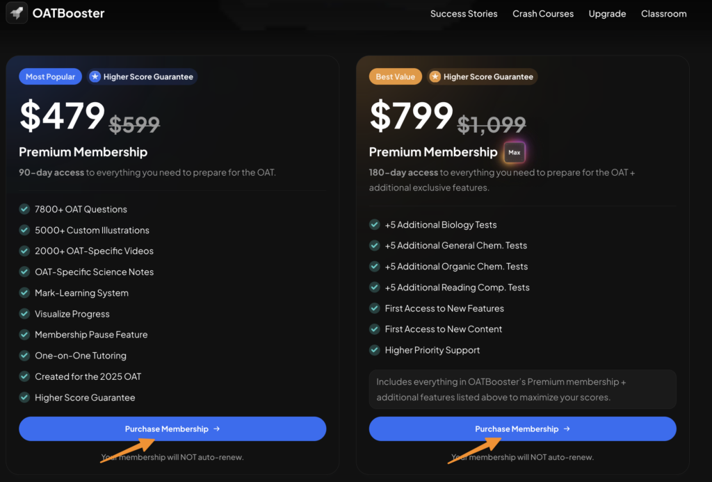 This will direct you back to the main OAT Booster website, where you need to choose your membership plan and click on "purchase membership" button.